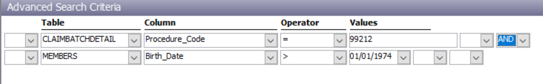 Procedure_Codeis99212andBirth_Dateis after01/01/1974. - The conditions are combined using the