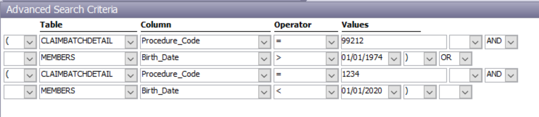 Procedure_Code = 99212ANDBirth_Date > 01/01/1974) are enclosed in parentheses. - The grouped conditions are evaluated together and combined with an